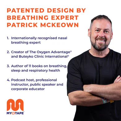 MyoTape is a patented sleep strip designed by breathing expert Patrick McKeown. It surrounds the mouth and uses light elastic tension to encourage lip closure and nasal breathing — without ever fully sealing the mouth. Made from soft hypoallergenic cotton with skin-safe adhesive. 30 strips per pack.