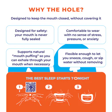 MyoTape surrounds the lips and uses light elastic tension to encourage closure. Your mouth is never fully sealed — so you can breathe naturally if you need to.