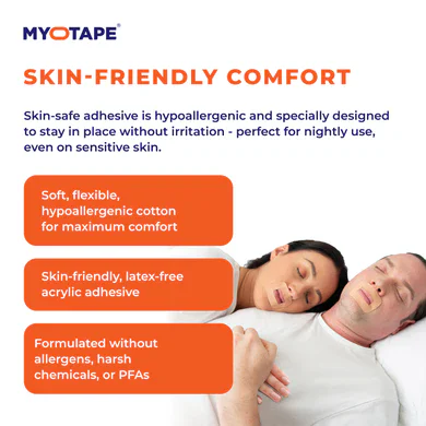 MyoTape uses a hypoallergenic, skin-safe adhesive specially designed to stay in place without irritation — perfect for nightly use, even on sensitive skin.